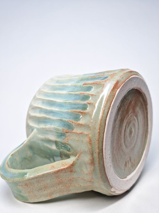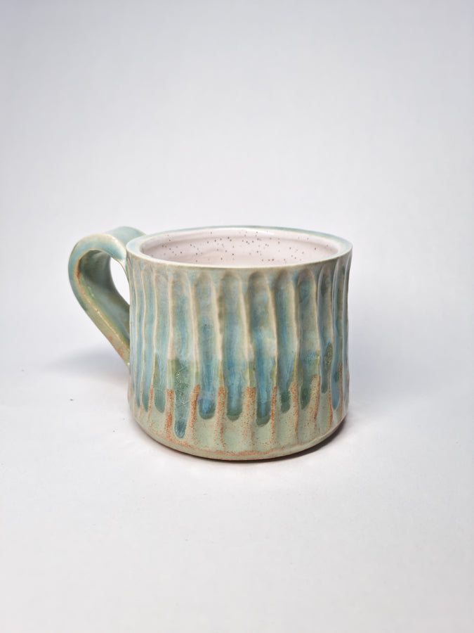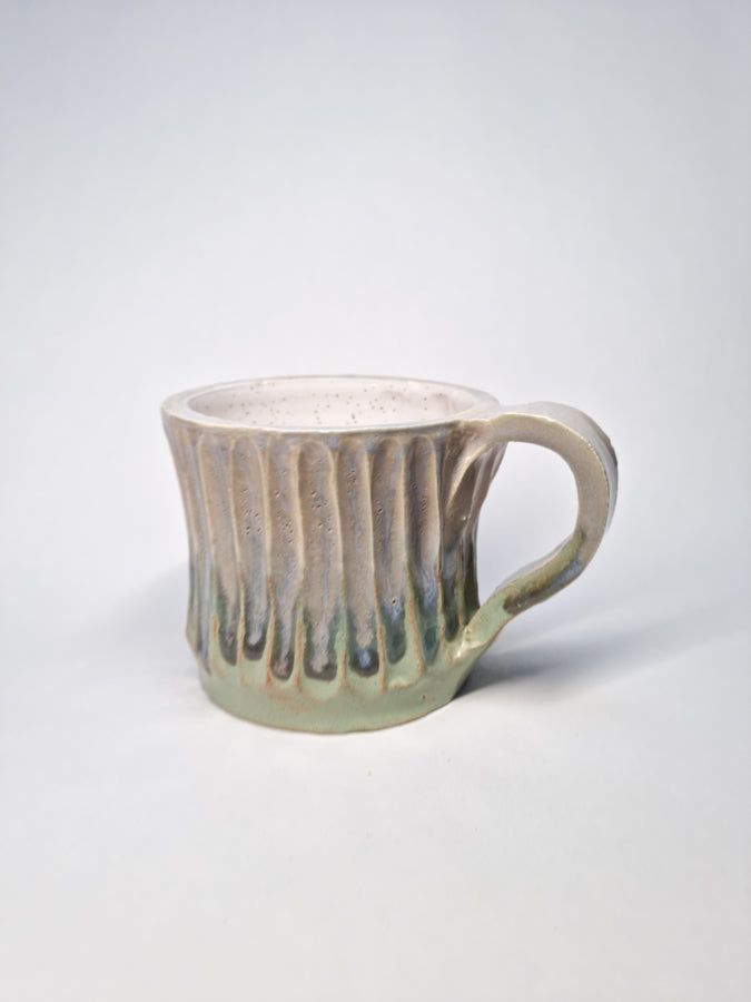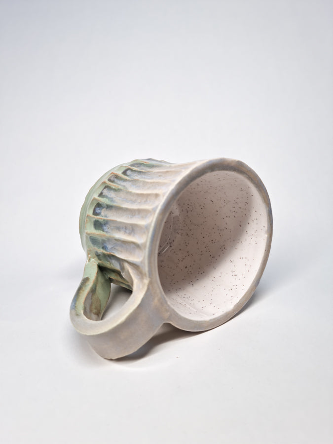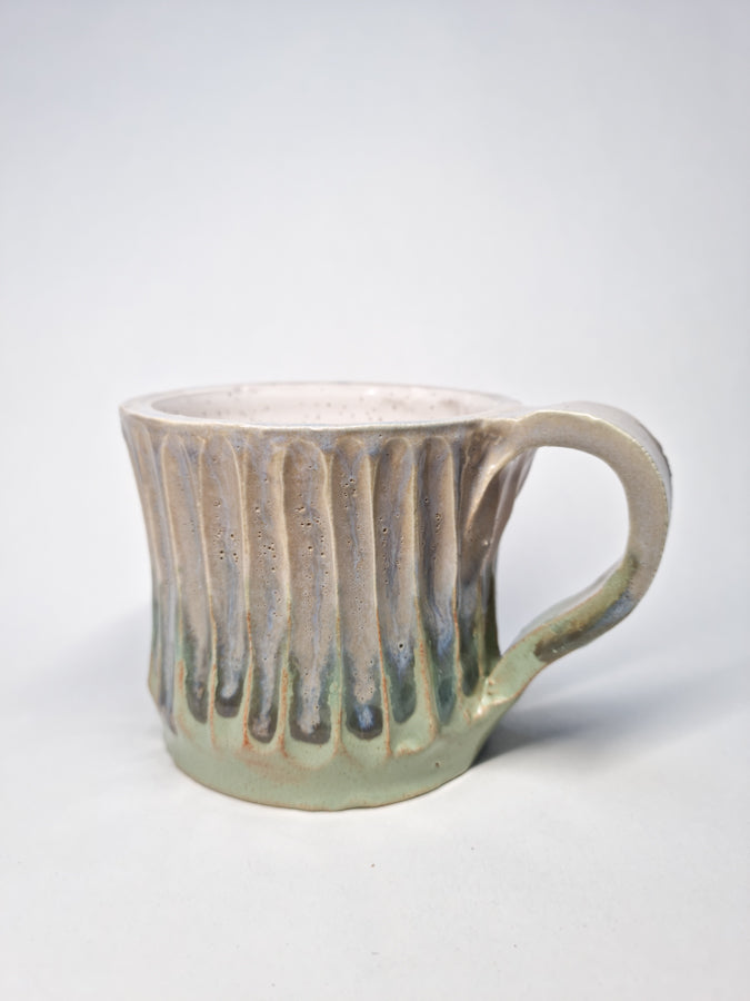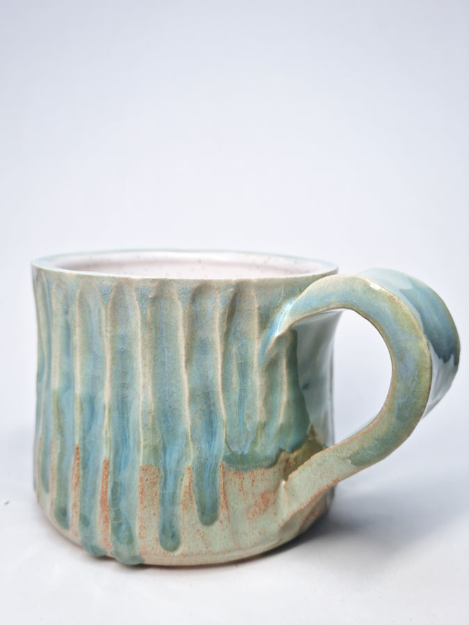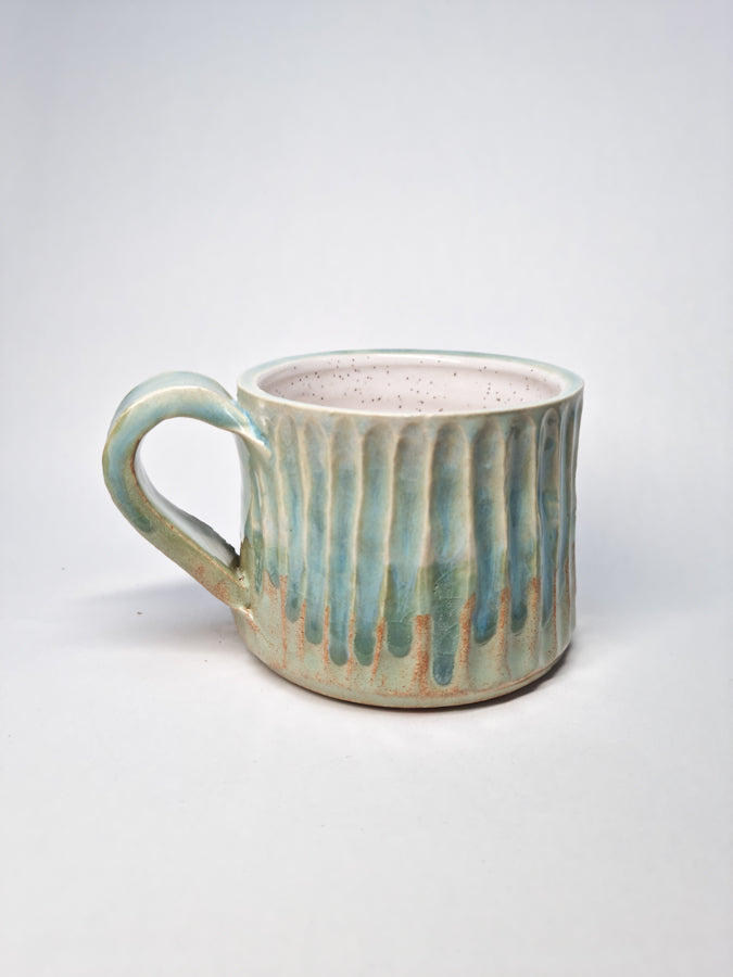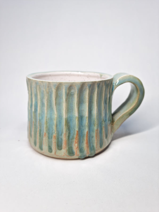 Due to the deep carvings, the texture of this mug feel’s beautiful in your hand. If you’re someone who appreciates good texture this piece is the one for you. With a range of flowing blues & greens.